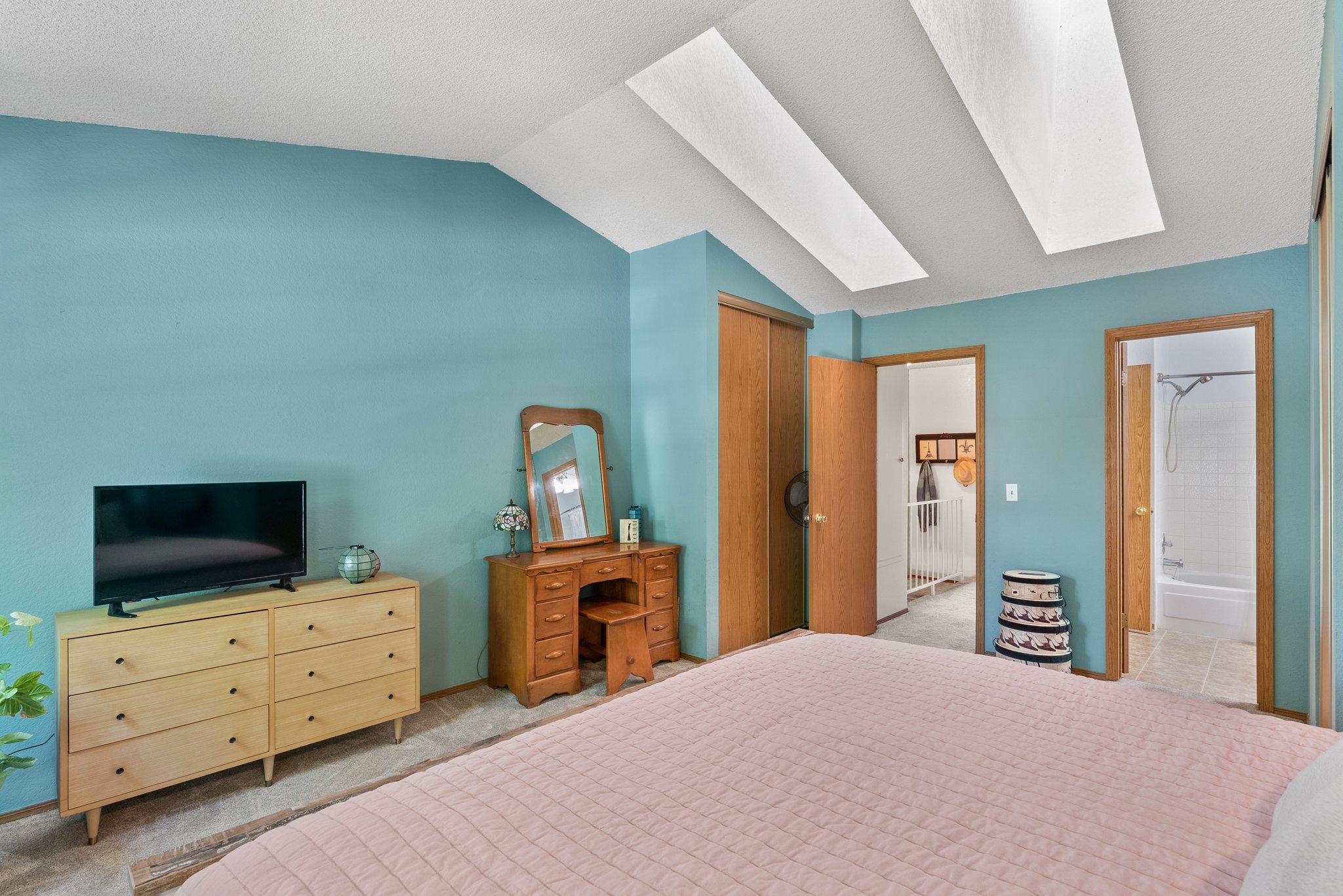 The kitchen has ample counter space for meal preparation and pull-up seating for casual dining or conversation. Just beyond the kitchen, you'll find a dedicated dining area with walk-out access to a private patio—perfect for al fresco dining and entertaining! Upstairs, find two inviting bedrooms that offer a peaceful retreat. The primary bedroom is especially impressive with vaulted ceilings, sky lights, dual closets, and ensuite access to the full bathroom. As an added convenience, the upper-level also hosts a laundry space, simplifying household chores.